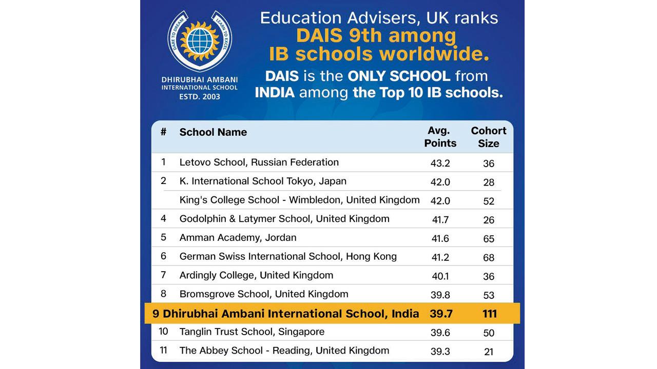 Dhirubhai Ambani International School (DAIS) has been ranked 9th among International Baccalaureate Diploma Programme (IBDP) schools worldwide, based on the IBDP Results 2025, in a list released by Education Advisers UK. Education Advisers, UK, are independent education consultants, specialising in providing information about private schools and colleges throughout the world. DAIS is the only Indian school to feature in the Global Top 10 — and notably, the school has the largest IBDP cohort among all schools in the Top 10 list.