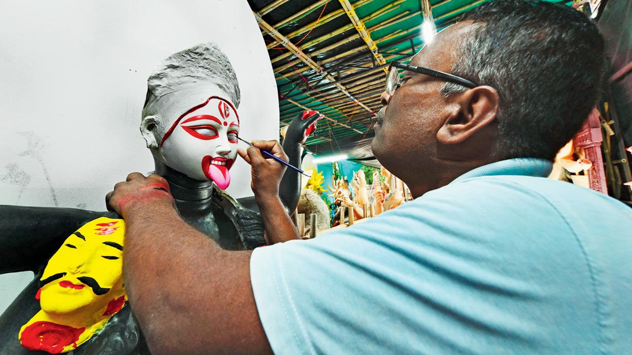 A sculptor gives finishing touches to a Durga idol at a Parel workshop. PIC/KIRTI SURVE PARADE