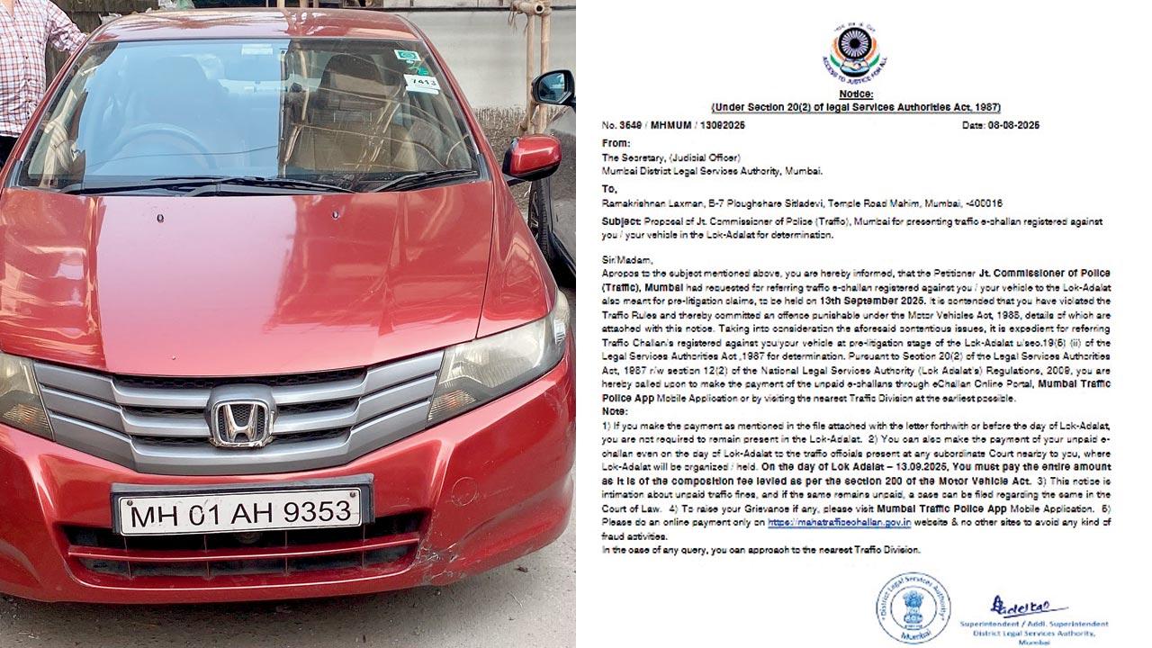 This isn’t the first such case either. As earlier reported by mid-day on March 15, Shanti Chheda, a 57-year-old businessman, received a notice from the District Legal Services Authority, Thane, asking him to appear at the Lok Adalat for two traffic violations. The notice, dated February 27, 2025, scheduled the hearing for March 22.